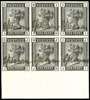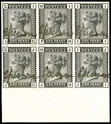 1880 1d Venetian red. Very fine unused imperforate bottom marginal block of six plate proofs lettered IG-JI printed in black on white wove paper, each stamp endorsed “specimen“ in manuscript. Some light creasing as to be expected nevertheless a spectacular multiple.