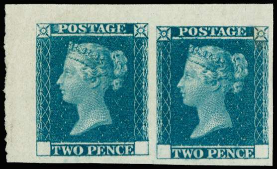 1841 2d Blue. Superb unused top left hand marginal pair from the small trial sheet of twelve without corner letters. Printed for distribution to postmasters announcing the new forthcoming issue. Spec. DP43.