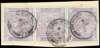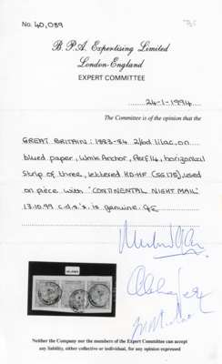 1884 2s6d Lilac on blued paper. Very fine used strip of three tied to small piece by “Continental Night Mail” cds' for OC.13.1899. Very late use and a scarce multiple of this difficult issue. 1994 BPA Cert. SG175, Cat £4,500.
