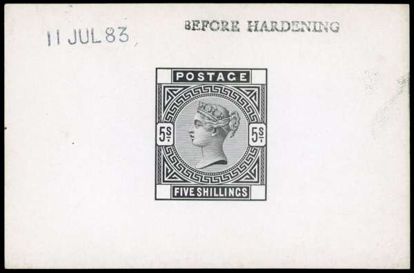 1883 5/- die proof in black on glazed card (92 x 60mm) endorsed ‘’BEFORE HARDENING'' and dated ‘’11 JUL 83'' very fine, scarce. SG 176var Ex ‘’Verus''