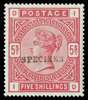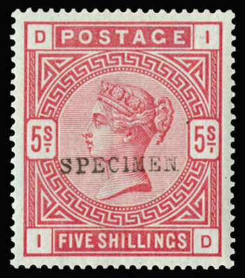 Great Britain 1884 5s Rose (Blued paper). Superb unused o.g. example lettered ID, overprinted "SPECIMEN" type 9. S…