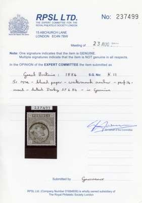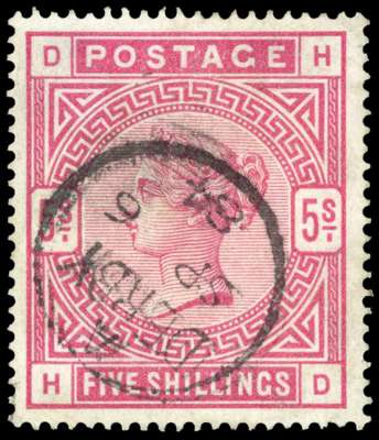 1884 5s Rose on blued paper. Very fine used example lettered HD cancelled by a Derby cds for SP.6.1884. A wonderful example of this very difficult issue. 2023 RPS Cert. SG176, Cat £3,250.