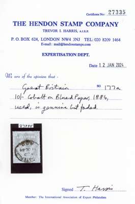 1884 10s Cobalt on blued paper (SG177a). Used example lettered MC cancelled by oval Registered datestamp for OC.1.1884. Slightly faded but a fair example of this scarce high value. A few perf faults, tone spots and stains. SG177a, cat £12,500. 2024 Hendon Cert.