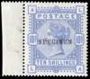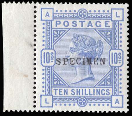 1884 10s Cobalt (White paper). Very fine and fresh unused o.g. left hand marginal example lettered LA, overprinted "SPECIMEN" type 9. Scarce so fine.
