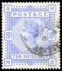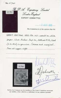 1884 10s Cobalt on white paper (SG182). Used example lettered MB cancelled by a part cds. Very lightly creased and small tear at upper right. SG182, Cat £7,500. 1988 BPA Cert.