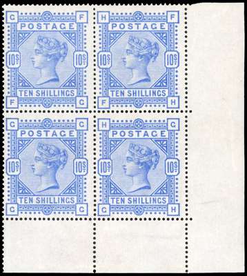 1883-84 10/- ultramarine (FG-GH) lower right hand marginal block of four, superb unmounted o.g. very fine and rare in such quality. SG 183 £9000+