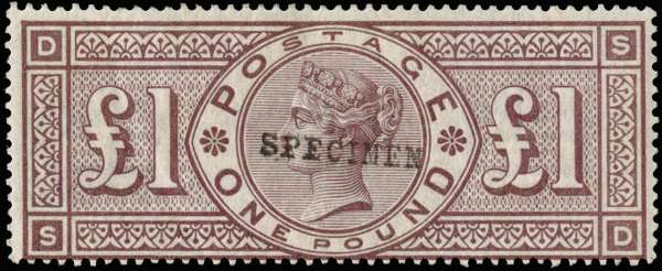 1884 £1 Brown-lilac (Wmk. Three Crowns). Very fine and fresh unused o.g. example lettered SD overprinted "SPECIMEN" type 9. Scarce. Spec. K15t. Ex. "Verus".