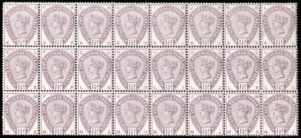 1884 1½d Lilac. A magnificent mint block of 24 lettered KE-ML. A couple of minor imperfections associated with such pieces nevertheless a superb item with 17 stamps being unmounted. The largest block we have handled in many years. Ex Fisher.