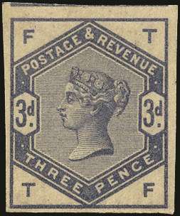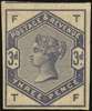 1884 3d Colour trial. Very fine unused o.g. imperforate example lettered TF printed on Crown watermarked paper in deep grey. Very scarce only two or three examples exist of each colour in private hands.