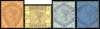 1883-84 Lilac & Green colour trials on coloured unwmkd gummed paper, including: 1½d mauve on orange, 2d mauve on yellow and 3d mauve on green and blue, part o.g. some imperfections 3d mauve on blue with vertical crease, otherwise fine, a scarce group. SG 188-191var priced £2200+