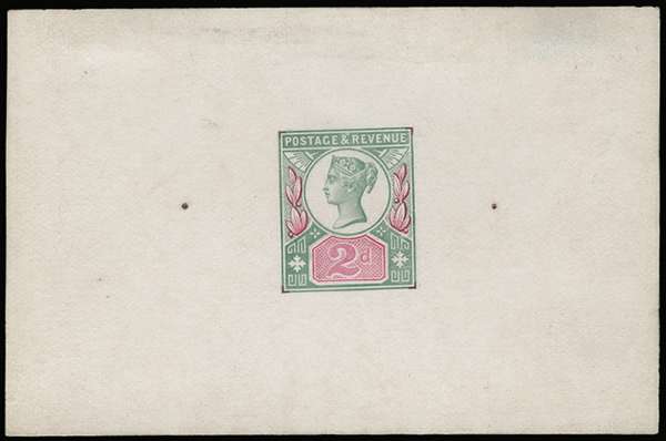 1884 2d "Jubilee" Rejected die proof. Very fine rejected die proof printed in green and pink on white glazed card showing Warren Williams's unadopted design that was submitted to the stamp committee in December 1884 and January 1885. Very rare, Wiseman rarity L. The only other recorded example resides in the R M Phillips collection at the British Postal Museum leaving this as the sole example in private hands. Ex. Stothert & "Aureum".