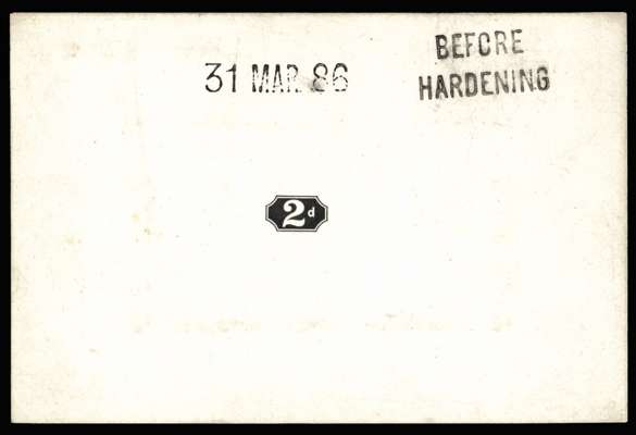 1886 2d "Jubilee" value tablet die proof. Very fine example of the unnadopted design with solid background, printed in black on white glazed card (92 x 61mm). endorsed "31 MAR 86" and "BEFORE HARDENING". Very scarce.