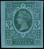1887 3d "Jubilee" Colour Trial. Very fine impeforate example printed in green on blue, gummed, Crown watermarked paper. A stunning example of this great rarity. Ex "Aureum".