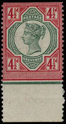 1892 4½d "Jubilee" Colour Trial (Line Perf 14). Very fine bottom marginal partially perforated colour trial on gummed, Crown watermarked paper. Head plate printed in grey-green and duty plate in carmine. An attractive example of this scarce trial in the issued colours. Ex "Aureum".
