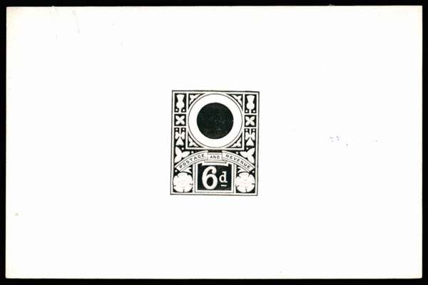 1887 6d "Jubilee" Die proof. Very fine embossed die proof of the Type B unadopted design with head area void, numerous minor differences can be seen to the issued design the most obvious of which is the additional line under the "d" of 6d. Very scarce. Ex. "Verus".