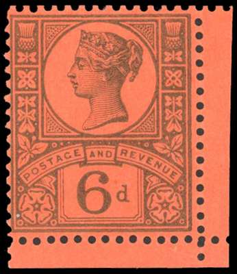 1887-1900 Jubilee 6d, (perf 14) lower right hand marginal, colour trial in green on orange gummed unwmkd paper, fine o.g. very rare. SG 208var £7000