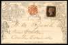 1840 1d Mulready Lettersheet (Forme 1, Stereo A7). Very fine used example uprated to the 2d per 1oz rate with an additional four margin 1d black Pl.2 lettered OJ both beautifully cancelled by crisp red MC's. Sent from Limerick to Castle Connell backstamped with a Limerick cds for JU.4.1840. A couple light archive folds neverthless a wonderful usage within the first month of issue. Spec. ME1. 1988 BPA Cert.