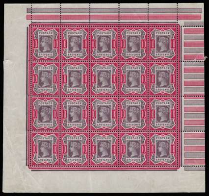1890 10d Dull purple & carmine "Jubilee". Very fine unmounted o.g. complete pane of twenty with full selvedge from marginal setting 2A, horizontal lined blocks and marginal rules with head plate rules cut away at corners. Taken from the right hand side of the 320 mill sheet, Pane O. Light diagonal crease affecting second column nevertheless scarce as a complete pane. Spec. K33(1). Ex. "Aureum".
