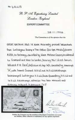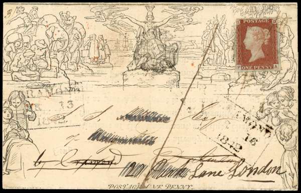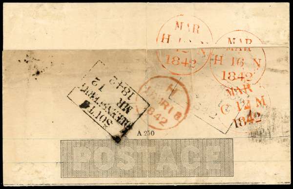 1840 1d Mulready lettersheet. Example sent from Linlithgow to Dalmeny, then to Cramond with the addition of an 1841 1d Red-brown (SG8, FA just cut into top left) tied by manuscript “1” and then readdressed to London with additional manuscript “1” on the entire. The stamp has been lifted to reduce staining but a quite remarkable and much travelled Mulready full of visual appeal. SG £12,500. With BPA Cert (1996).