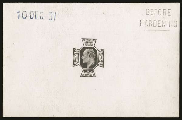 1901 9d Die proof (Head Plate). Very fine example printed in black on white glazed card (92 x 59mm), dated "10 DEC. 01" and endorsed "BEFORE HARDENING". Very scarce. Ex. "Minoru".