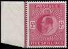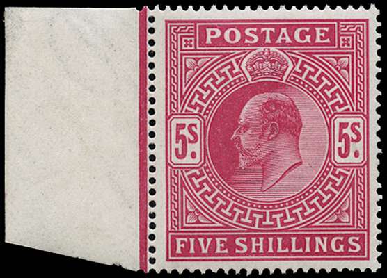 Great Britain 1902 5s Bright carmine. Very fine unmounted o.g. left hand marginal example printed by DLR. Fluoresc…