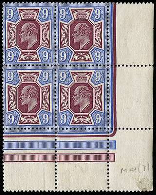 Great Britain 1911 9d Dull reddish purple & blue. Very fine unmounted o.g. block of four printed at Somerset House…