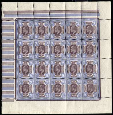 Great Britain 1913 9d Deep plum & blue. Very fine unmounted o.g. complete pane of twenty printed at Somerset House…