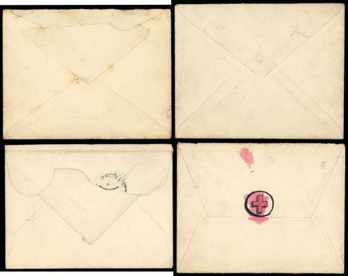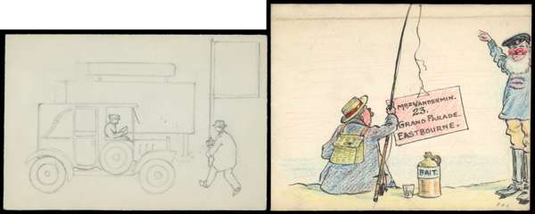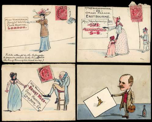 1908-18 delightful selection of seven hand-painted humorous envelopes by Edgar A Lambert to Miss Vandermin, four addressed to Guy's Hospital, two to Eastbourne (one re-addressed from Camberwell) and one from Army Post Office in France; two with original contents. Also three further covers, unsent, two hand-painted and one hand drawn Condition mixed. A most appealing group. (10)