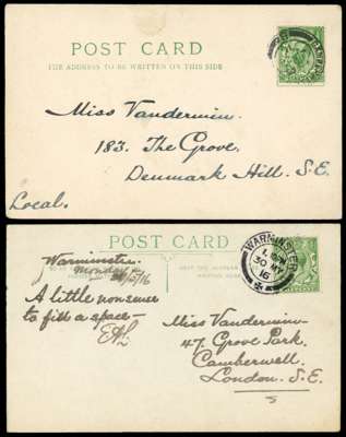 1911-16 attractive selection of five used hand-painted humorous postcards by Edgar A Lambert to Miss Vandermin depicting Trees, Gallant Soldier, Royal Warrant, Reverend Edgar Lambert and Holiday Sketches. Also another eight depicting various scenes/people unposted. A delightful group. (13)
