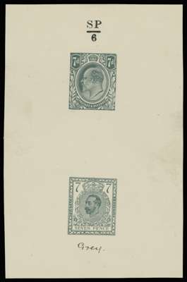 1911 7d Grey colour trials in Edwardian colours. A very fine pair of se-tentant colour trials of the Edwardian design and proposed George V design (30mm spacing) printed on white wove ungummed paper, printed "SP/6" above Edwardian value and manuscript "Grey" below the George V value. A spectacular trial, unique in private hands.