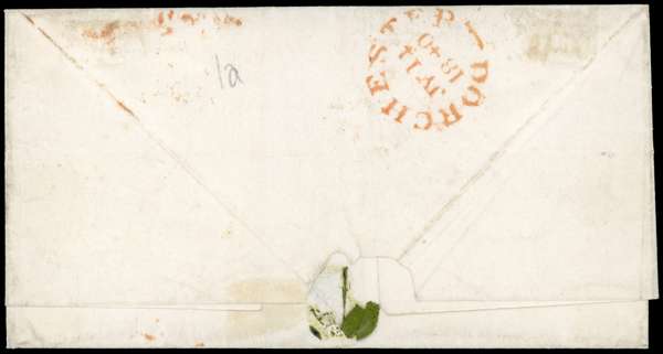 1840 entire letter addressed to Dorset, bearing 1d grey-black Plate 1a (FK), four clear margins, neatly tied by red MC, with ‘No.2’ receiving house h/s alongside, backstamped by Dorchester d/s for JY 14, very fine. SG 3