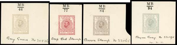 1911 5d Hentschel essay. Very fine set of four imperforate colour trials printed in grey green, deep red, brown & payne grey (Manders Bros ink No.46, 77, 84 & 94 respectively) on white unwatermarked paper, endorsed at foot "Grey Green no 20836", "Deep Red stamp", "Brown Stamp No.22065" and "Payne Grey no 22191, 14.2.11". Very scarce group.