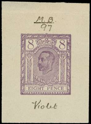 1910 8d Hentschel essay in violet on white wove paper, (31 x 44mm) with m/s ‘’MB/97'' above design and ‘’Violet'' at foot, attractive and scarce.