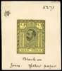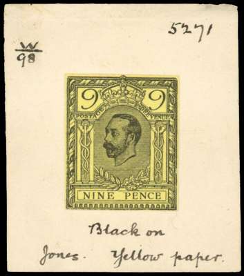1910 Hentschel essay 9d printed in black on yellow paper affixed to thin card (40 x 43mm) with manuscript ‘W/98’ and ‘5271’ above design and ‘Black on Jones yellow paper’ below. Attractive