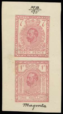 Great Britain 1911 7d & 1s Hentschel essays. Two very fine examples printed in magenta, mounted together on thin w…