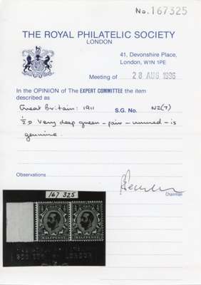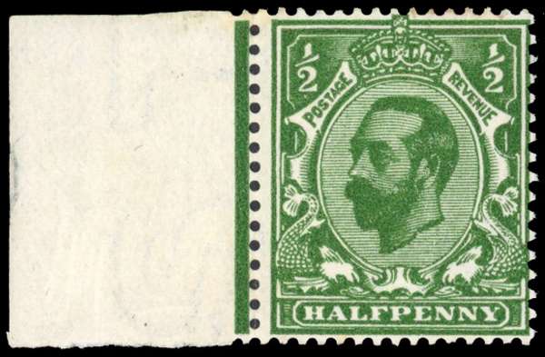1911 ½d Very deep green (Die 1B, Wmk Crown). Very fine unmounted o.g. marginal example of this scarce shade. SG325var, Spec. N2(7). 1996 RPS Certificate for a horizontal pair from which this was taken. Cat £650