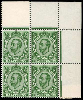 1912 ½d Myrtle green (Die 2, Wmk. Crown). Very fine unused o.g. top right hand corner marginal block of four (Three unmounted o.g. examples). Scarce shade. SG338var, Spec. N4(4). 1976 RPS Cert. Cat £900.