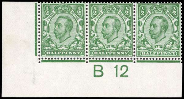1912 ½d Bluish green (Die 2, Wmk. Crown). Superb unmounted o.g. bottom right hand corner B 12 Control strip of three. Scarce shade. SG338var, Spec. N4(5). 2000 RPS Cert. Cat £600.