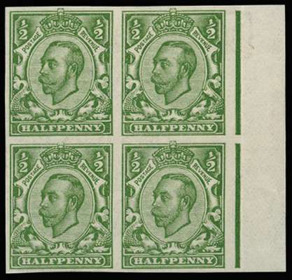 1912 1/2d Green (Wmk. Multiple Cypher). Very fine unused o.g.(two stamps unmounted o.g.) right hand marginal imperforate block of four. Spec. N6(1)f.