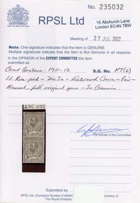 1911 1d Rose-pink (Die 1A, Wmk. Crown). Very fine unmounted o.g. vertical pair of this scarce shade. SG328var, Spec. N7(6). 2022 RPS Cert. Cat £400.