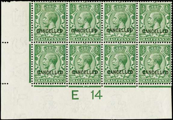 1913 ½d Green. Very fine unused o.g. corner marginal E 14 (I) control block of eight overprinted "CANCELLED" type 24. A very scarce control piece printed by Harrison recorded by Samuel as probably from a colour trial printing. Spec. N14v.