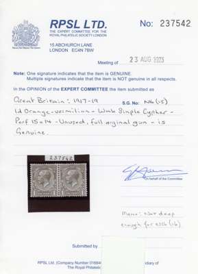 1912 1d Orange-vermilion (Wmk. Royal Cypher). Unmounted o.g. horizontal pair. 2023 RPS Cert. Spec. N16(15). Cat £450