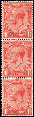 Great Britain 1922 1d Pale scarlet (Wmk simple cypher). Superb unmounted o.g. vertical strip of three of this very…