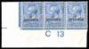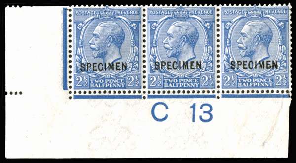 1913 21/2d Cobalt blue. Very fine unused o.g. bottom corner marginal C13(I) control strip of three overprinted "SPECIMEN" type 26, produced as a colour standard for the first Harrison printing. Rare, control piece.