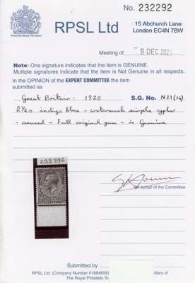 1920 2½d Indigo blue. Very fine unmounted o.g. bottom marginal example of this rare shade. 2020 RPS Cert. SG373, Spec. N21(14). Cat £4,500.