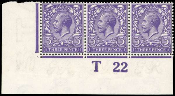 1922 3d Very deep violet. Unused o.g. bottom left hand corner marginal T22 control strip of three. Heavily mounted but spectacular colour. 2021 RPS Cert, Spec. N22(10).