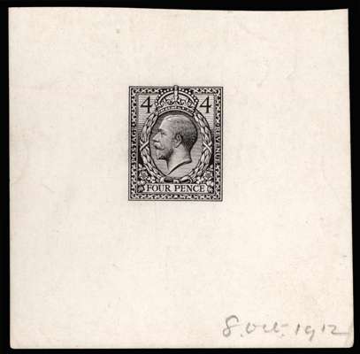 1912 4d Mr. Eve's Wreath design die proof. Very fine cleared example printed on black on white glazed card (66 x 66mm) dated "8 oct 1912" below design. Rare. Fig.28.
