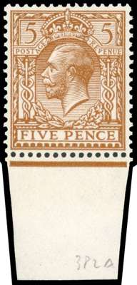1912-24 5d brown, lower marginal, variety No Watermark, mint unmounted o.g. fine example of this variety. SG 382a £1250