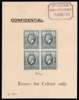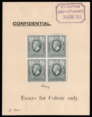 1913 7d Eve's Wreath design colour essays. Very fine ungummed imperforate block of four essays (Fig 30a) in grey on white unwatermarked card mounted on thick card (88 x 103mm). Showing "CONFIDENTIAL" and "Essays for Colour only.", ink manuscript "Grey" below the stamps and "E201" at lower left, purple "STAMPING DEPARTMENT/3 JAN. 1913." handstamp at top right. Most attractive and rare.