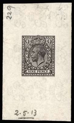1913 9d Die proof. Very fine fully cleared example printed in black on gummed watermarked Royal Cypher (Sideways) paper (38 x 64mm), dated in manuscript "2.5.13" and numbered "229". Unique.
